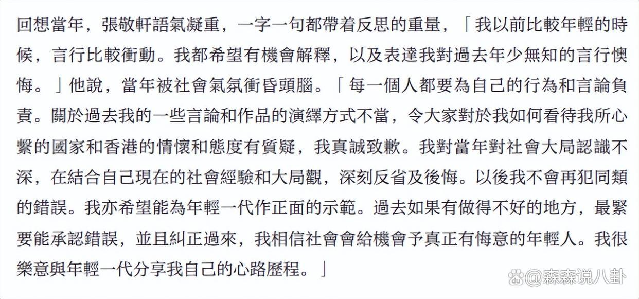 张敬轩回忆年青的过激行径,说年青的时间言行相比欢叫,但愿给他契机评释对往常言行的消极,当年是被社会习尚冲昏头脑,深化反省及后悔,不会再犯同类不实。还说东谈主谁无过,要津是肯不肯承认,愿不肯意改正,坦言以身为广州东谈主而骄慢。