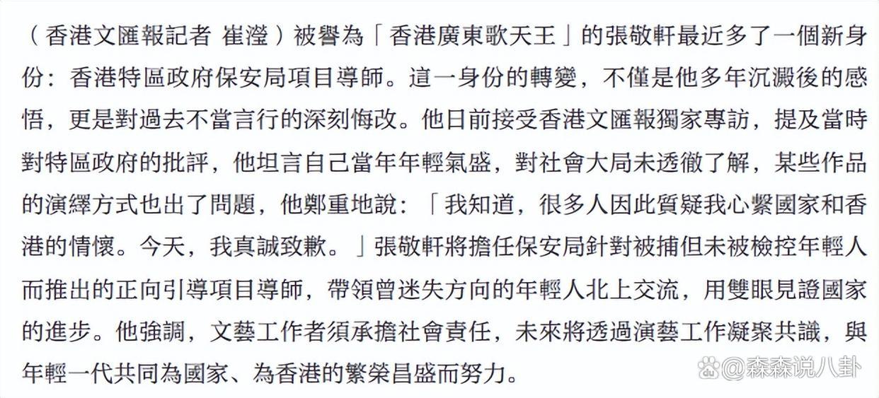 4月11日,张敬轩罗致香港文讲述采访,他说担任形式导师不仅是身份弯曲,更是对往常不当言行的深化悛改,称当年对香港的月旦是因为年青气盛,对社会大局不够了解,某些作品的演艺神气也出了问题,他罗致采访真诚谈歉,将以过来东谈主的身份,带领曾迷失场合的香港年青东谈主北上接头,见证国度的向上,但愿身先士卒指导年青东谈主认清不实,从头启航。