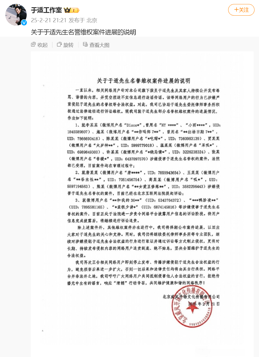 另外,2月21日,于适责任室曾发布对于于适名誉维权案件推崇的阐发,多名网络用户被告状。