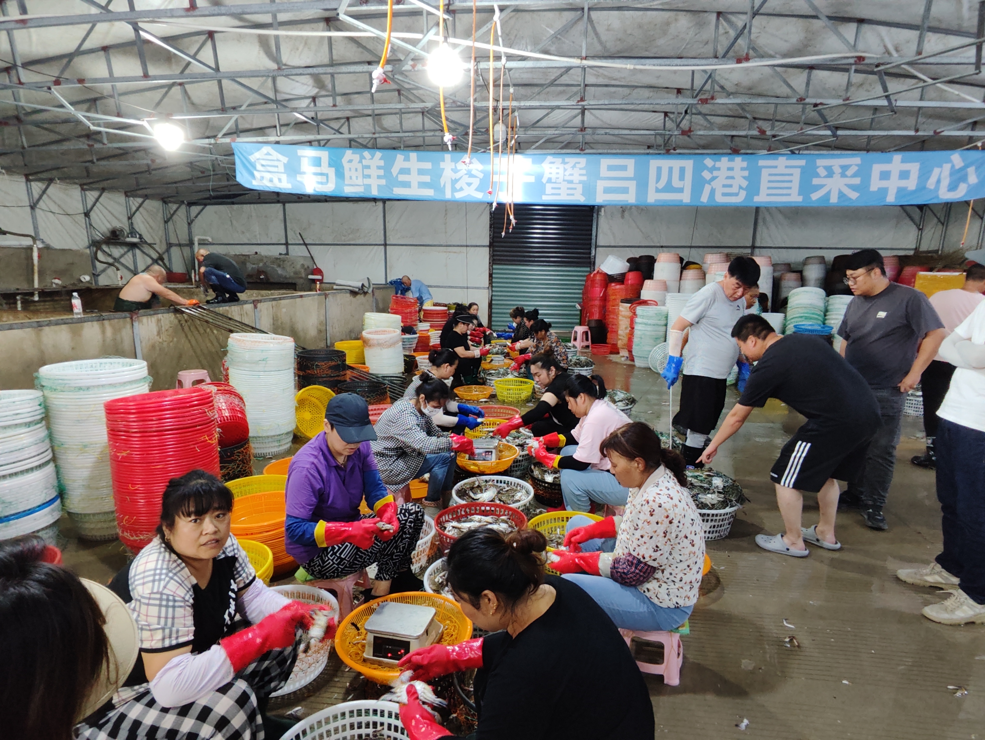图:位于吕四港的直采中心,责任主说念主员在加紧分拣刚上岸的鲜美梭子蟹。